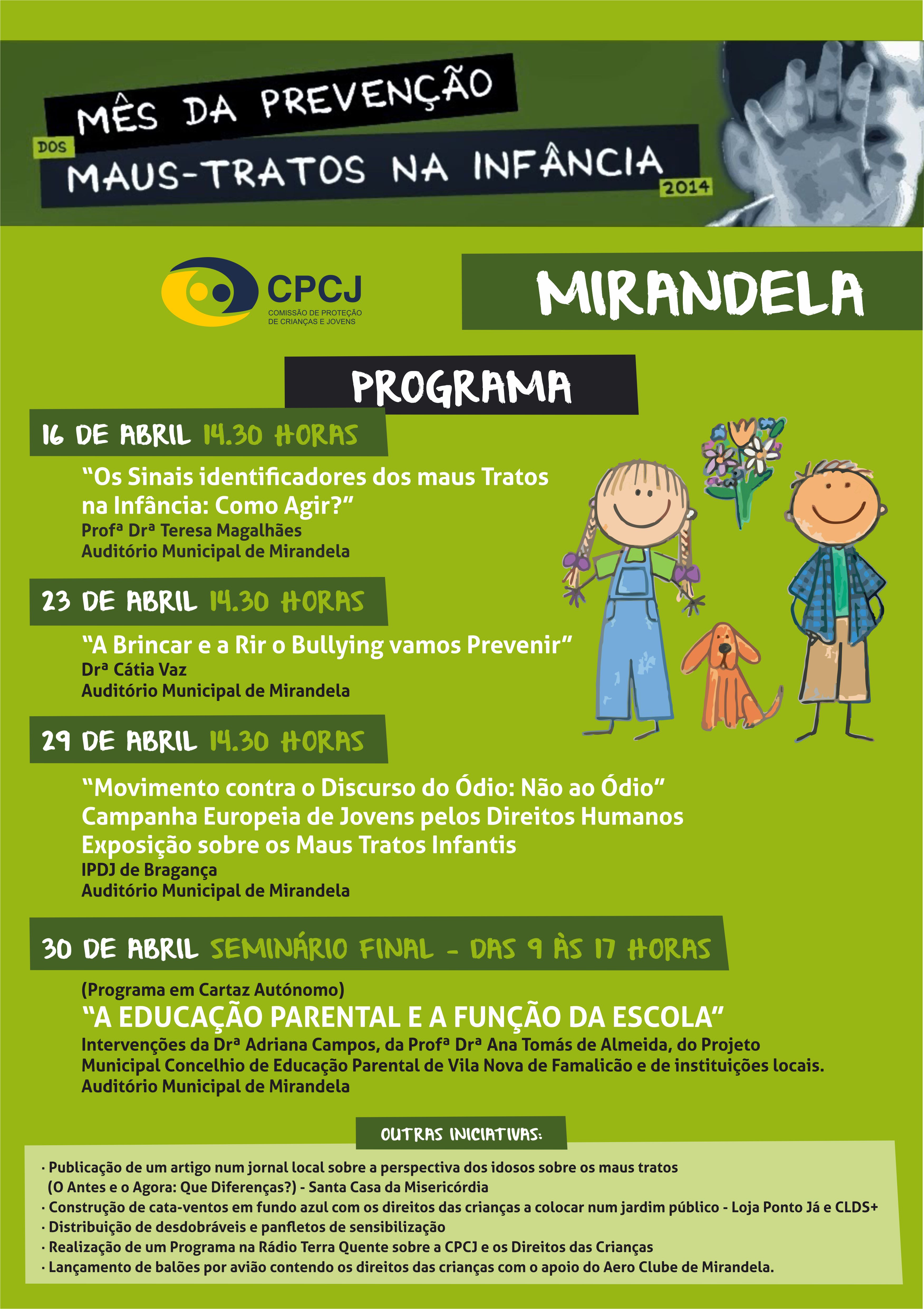 Associando-se à iniciativa da CNPCJ -Comissão Nacional de Protecção de Crianças e Jovens-, que elege Abril como o mês da prevenção dos maus tratos na infância, a CPCJ de Mirandela organizou programa para execução durante todo o corrente mês de Abril, com as actividades que agora se divulgam em anexo, todas no âmbito do referido contexto temático.