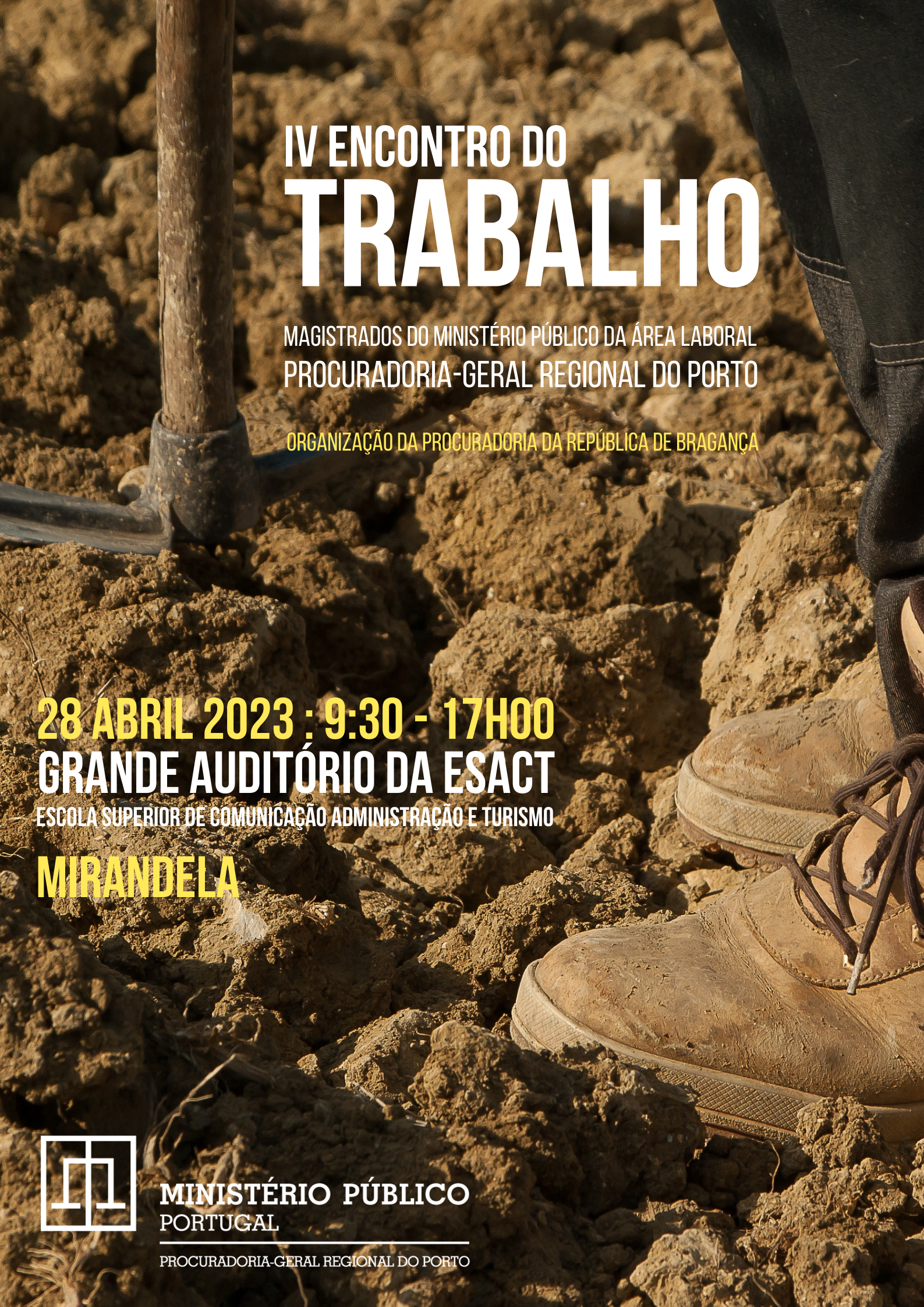 No dia 28.04.2023, entre as 9h30 e as 17h00, em Mirandela, no grande auditório da ESACT [Escola Superior de Comunicação Administração e Turismo], decorreu o IV ENCONTRO DO TRABALHO, dirigido aos magistrados do Ministério Público da área das comarcas dos Tribunais da Relação do Porto e de Guimarães, com intervenção na jurisdição laboral, presidido pelo Procurador-geral regional do Porto.